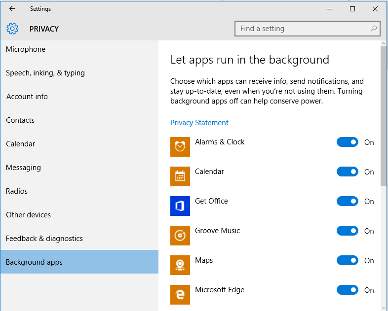 Alarms and Clock, Photos, Store and some other apps are set to work in the background. For example Alarms and Clock is able to show you notification of you alarm when they are running. If you don’t use these features then you can turn them off. The Setting app has a section for these Background Apps where you can manage which app can run in background. Follow the following step to disable background apps.
