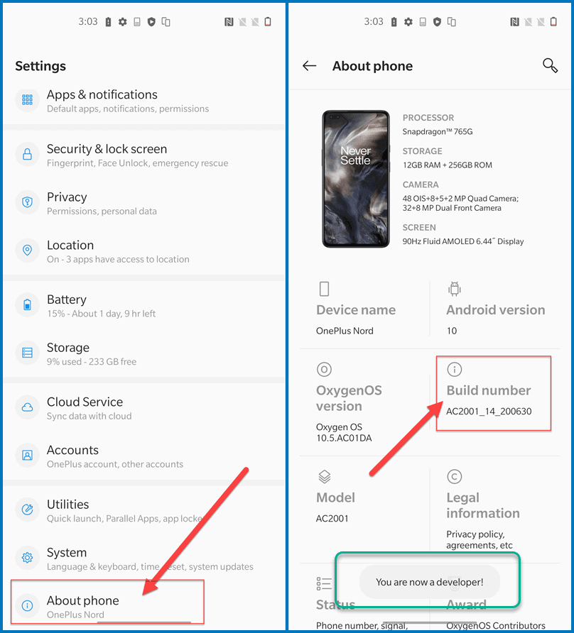 • On your OnePlus Nord, go to Settings. Then scroll to the end of the list and select About phone.