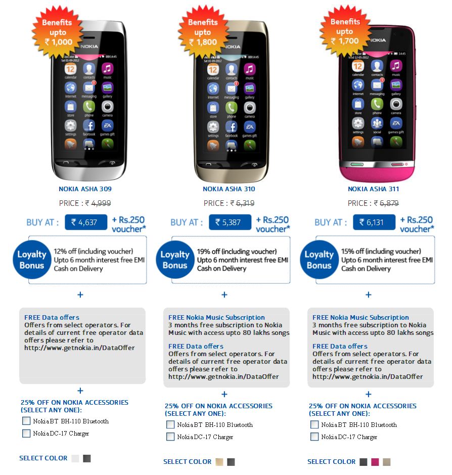 If you choose Nokia Asha, you can get benefits up to Rs. 1800, which includes a discount on the phone’s MRP and upto 25% off on various accessories available for the selected phone. There’s also a free 3 month subscription to the Nokia Music service on purchase of most of Asha phones.