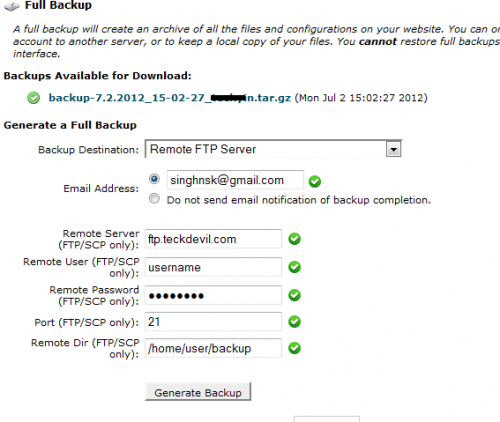 - Click on generate Backup. All your data will be compressed and then transferred to the new server automatically by the cPanel.