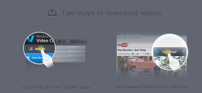 One of the coolest thing about Wondershare Video Converter is that it inherits the ability to download online videos from various websites. All you need to do is to click Add URL and enter the URL of Video page. Otherwise if you allowed Wondershare to install an addon to your browser, you can click on the download link above the online video to be able to save it to the disk.