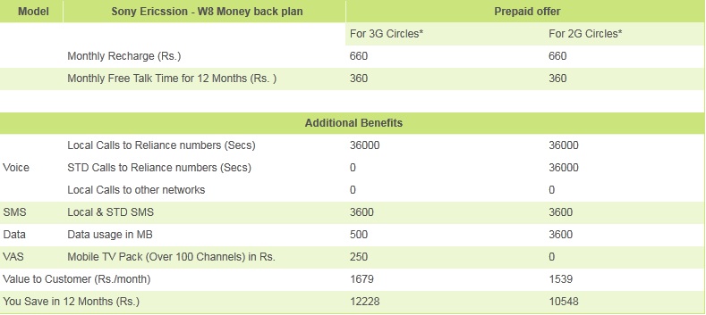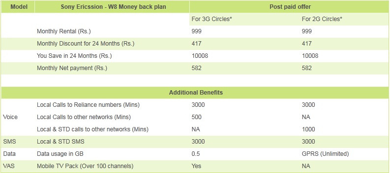Sony Ericsson W8 comes with a free Reliance 3G SIM with 100% Money back offer. This offer can be availed on postpaid and prepaid connections anytime, anywhere.